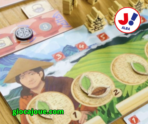 Contenuto: 4 plance giocatore, 28 Pagode che rappresentano i giardini del Tè, 32 meeple Operai, 4 meeple Barca, 4 segnalini punti Vittoria, 30 gettoni Tazza, 1 segnalino Round, 1 segnalino primo Giocatore, 28 tessere Pergamena, 30 gettoni Imperatore, 18 gettoni Bonus Regione, 40 tessere Tazza, 84 gettoni Foglia di Tè, 1 tabellone di gioco, 44 carte iniziali, 16 carte Imperatore, 45 carte Azione, 30 carte Carovana, 5 carte Riassuntive, 1 regolamento.